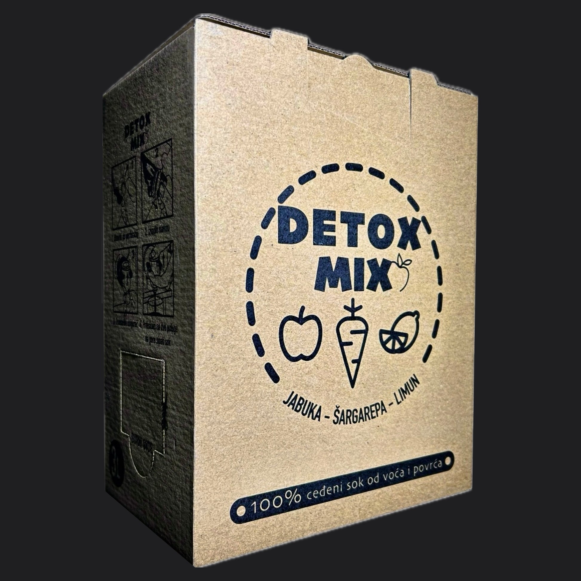 Пастеризовани цеђени сок од 55% јабуке, 35% шаргарепе и 10% лимуна без додатка шећера, воде, боја и арома.